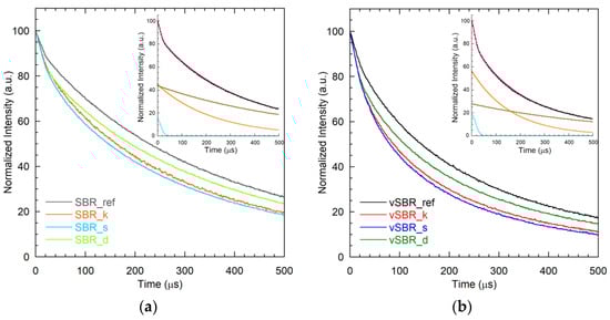 1H FIDs of the uncured (a) and cured (b) SBR compounds. Examples of fitting of the 1H FIDs of SBR_d and vSBR_d are shown in the insets, which report the experimental data (black dots), the best-fit function (red), the single Gaussian component (cyan), and exponential e1 (orange) and e2 (brown) components.