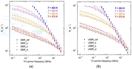 Here, NMRD curves were recorded for the uncured and cured SBR compounds in the 0.01–35 MHz Larmor frequency range at different temperatures from 303 to 373 K. A selection of the obtained NMRD curves is shown in Figure 6. For all samples, at T < 323 K, R1 is dominated by segmental dynamics (regime 0 of the TR model). At higher temperatures, two regions with different power law dependences of R1 on ω can be distinguished: at high frequencies, γ values in the range 0.7–0.8, decreasing by increasing the temperature, are found, due to the overlap of segmental dynamics with the Rouse regime (regime I); at low frequencies, a power law dependence with γ ≃ 0.25–0.28, typical of regime I, is observed. The crossover point between regime 0 and regime I shifts towards lower frequencies as the temperature decreases. Trends of R1 with decreasing temperature at different frequencies can be explained by the slowdown of segmental dynamics, as described in detail in ref. []. At all temperatures, the introduction of resin leads to a shift of the crossover point between the two regimes towards lower frequencies, which follows the order SBR_d (vSBR_d) < SBR_s (vSBR_s) < SBR_k (vSBR_k). Additionally, this shift is accompanied by a decrease in R1 at high frequencies and an increase at low frequencies. This behavior can be ascribed to the reduction in segmental mobility induced by the presence of resin for both uncured and cured compounds. This effect is less prominent in the case of Dertoline, in agreement with the observed lower increase in Tg found for SBR_d and vSBR_d. Moreover, a shift in R1 curves towards a lower frequency is observed on passing from uncured to cured compound due to the slowdown of dynamics induced by crosslinking.