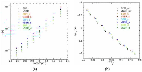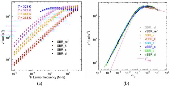 To further investigate the effect of resins on both segmental and polymer dynamics, NMRD curves were converted into NMR susceptibility (χ″(ω) = ωR1(ω)) representation to construct χ″(ωτs) master curves via the frequency–temperature superposition (FTS) principle [,,,,] and, therefore, to determine the correlation times of segmental dynamics (τs), as described in detail in ref. []. Figure 7a and Figure S4 show a selection of χ″(ω) curves obtained at different temperatures for the uncured and cured samples, respectively. At the lowest temperatures, the χ″(ω) curves show a maximum corresponding to the condition ωτs ≃ 1. As the temperature increases, the acceleration of segmental dynamics leads to a shift in the curves towards higher frequencies. Conversely, at each temperature, the addition of resin causes a shift of the χ″(ω) curves towards lower frequencies due to the slowdown of segmental dynamics. In Figure 7b, the χ″(ωτs) master curves are reported together with the contribution of segmental dynamics calculated on the basis of the Cole–Davidson spectral density function [,], with the characteristic parameter βCD = 0.12. As shown in Figure 8a, for both the uncured and cured samples, the values of τs determined from the master curves’ construction increase upon resin addition following the order SBR_ref (vSBR) < SBR_d (vSBR_d) < SBR_s (vSBR_s) < SBR_k (vSBR_k). Moreover, an increase in τs is observed after curing, attributed to the constriction of segmental mobility caused by the formation of permanent crosslinks. Following a procedure employed in previous works [,], the curves of τs vs. temperature were analyzed in terms of Equation (4), which was obtained by recasting the Vogel–Fulcher–Tammann (VFT) equation [].
