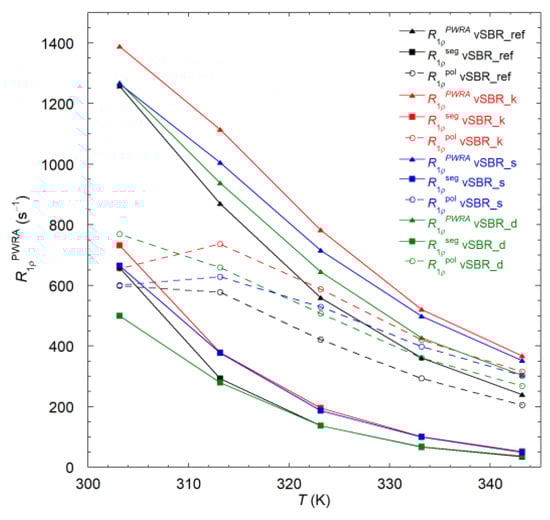 Additional information on dynamics in the kHz frequency regime was obtained by measurements of 1H T1ρ relaxation times for the cured SBR compounds at a spin lock frequency of 46 kHz as a function of temperature (293–353 K). As mentioned above, all the samples show biexponential recovery curves, which were analyzed using Equation (3). As shown in Table S2, for all the samples, both T1ρ,a and T1ρ,b increase when increasing the temperature, while Wa decreases. However, an analysis in terms of individual components might lead to an over-interpretation of T1ρ data in terms of dynamics, due to the unclear origin of the biexponential behavior and to the partial averaging operated by spin diffusion. Information on the “averagE″ dynamic behavior of the system under investigation can instead be obtained by considering the population weighted rate average (), calculated as follows:
