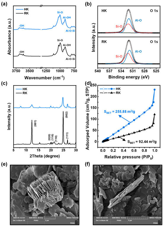 (a) FT-IR spectra, (b) O 1s XPS spectra, (c) XRD patterns, (d) BET analysis, and FESEM images of (e) RK and (f) HK particles.