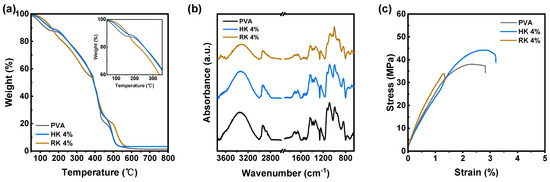 (a) TGA curves, (b) FT-IR spectra, and (c) stress–strain curves of PVA, PVA/HK 4 wt.%, and PVA/RK 4 wt.% MMMs.