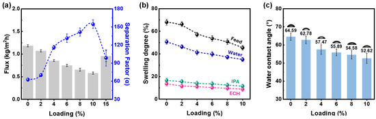 HK loading effect on (a) pervaporation separation performance, (b) swelling degree, and (c) contact angle on PVA/HK MMM surfaces.