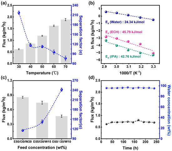 The feed temperature was increased from 30 to 70 °C, and the PV test was performed with ECH/IPA/water at a 50/30/20 (w/w, %) feed mixture composition. The flux increased linearly with feed temperature, but a three-fold decrease in the separation factor was observed (Figure 5a). Additionally, the decrease in the separation factor was more pronounced between 30 and 40 °C; thereafter, it decreased linearly. The increase in flux can be attributed to the enhanced driving force (vapor pressure) of the components. Furthermore, the thermal agitation of the polymer chain enhances the free volume across the PVA membrane, thereby increasing the rate at which permeating components are transported [8,9,10]. The sharp decrease in the separation factor between 30 and 40 °C suggested that the membranes produced in this study were sensitive to the feed temperature. This is because, as observed in the XRD study, the basal plane spacing (0.72 nm) in the HK sheet was sufficient to enable the transportation of all three components without manifestation of the sieving effect; however, spatially, the hydrophilicity of the membrane system resulted in satisfactory separation performance. However, increasing the temperature increased the vapor pressures of ECH, IPA, and water at the membrane boundary layer. This resulted in the adsorption of ECH- and IPA-rich water molecules onto the membrane surfaces and their subsequent diffusion through the expanded PVA chain. The temperature-dependent flux of the PVA-based membranes was characterized using the Arrhenius equation [30,31].