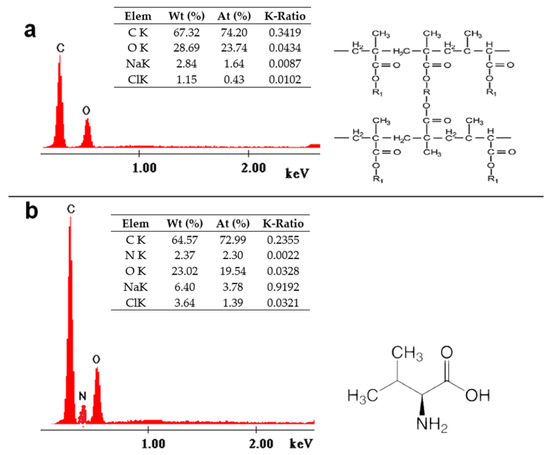 The mass and atomic percentages decrease in the case of the polymer functionalized with the amino acid Valine. At the same time, the appearance of 2.37% (Wt) or 2.30% (At) for N is noticed, which is specific to the -NH2 group in the amino acid structure.