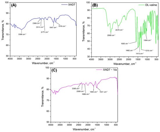Figure 3 shows the FTIR spectra of Amberlite XAD7 resin (Figure 3A), the amino acid DL-valine (Figure 3B), and the material obtained after functionalization by impregnation (Figure 3C).