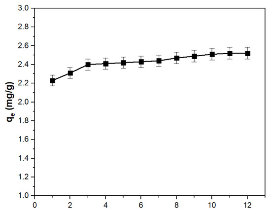 The influence of the pH of the Ga(III) solution on the adsorption capacity is presented in Figure 5. It is discerned that the adsorption capacity exhibits a very slight increase, reaching the maximum value at a pH beyond the point corresponding to the point of zero charge. In accordance with existing literature data [33], the specific Ga(III) species coexisting in solution can be Ga(OH)2+, Ga(OH)3, or Ga(OH)4−.