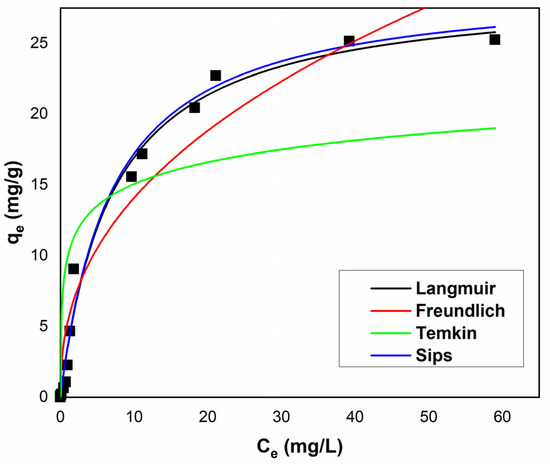 To discern the behavior of Ga(III) ions on the surface of the XAD7-Va material during the adsorption process, the experimentally modeled data were subjected to analysis using four distinct equilibrium isotherms: Langmuir, Freundlich, Temkin, and Sips. The adsorption isotherms depicting Ga(III) on the polymeric material XAD7-Va are presented in Figure 8, with the corresponding isotherm parameters provided in Table 3.