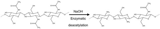 Chitosan, a biocompatible and biodegradable polysaccharide, is naturally derived through the N-deacetylation of chitin []. Its structure is closely related to that of cellulose and is most abundantly found in fungi and the exoskeleton of crustaceans [,]. Widely applicable across agriculture, food industry, and biomedical research, chitosan is a cationic linear polymer with repeating subunits of D-glucosamine and N-acetyl D-glucosamine linked by 1-4 glycosidic bonds (Figure 1). Chitosan is the only polycation in nature, and its charge density depends on the acetylation degree and pH. Chitosan is insoluble at alkaline and neutral pH values, but readily soluble in the presence of acids due to the protonation of amines []. Because of its cationic property, chitosan provides various biopharmaceutical properties, including mucoadhesion, transfection, and permeation enhancement []. Physicochemical properties, like solubility, vary with the degree of deacetylation (in the range of 5–95%) and molecular weight (50–20,000 kDa) [,,]. Chitosan acts as a permeation enhancer irrespective of the degree of deacetylation on a low-molecular-weight polymer. The solubility of the polysaccharide is inversely proportional to the molecular weight. Furthermore, low-molecular-weight and less deacetylated chitosan can intensify the antibacterial effect against Gram-negative bacteria but decrease it against Gram-positive bacteria []. Therefore, the careful selection of an optimal-grade polymer is crucial for an effective drug delivery []. However, a high degree of deacetylation (DD) may lead to an increased risk of toxicity. The DD of chitosan is the amount of acetyl groups that have been removed from the chitosan structure, and a higher DD means that there are more available amine groups [].