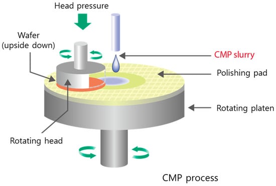 Chemical mechanical polishing/planarization (CMP) is a universally recognized procedure for providing a global surface finish to different materials for a variety of applications such as jewelry, precise optics, laser techniques, and electronics [1,2,3,4]. It is a surface smoothening process with the combination of controlled mechanical force such as pressure or the relative motion of the polishing tool and a chemical reaction for achieving desired materials removal in the semiconductor industry [1,4,5,6,7,8].