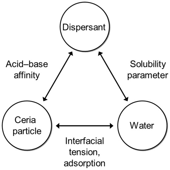 To solve these problems and enhance the dispersion of calcined ceria, dispersants and surfactants are added to minimize inter-particle interactions. Several researchers have specifically investigated enhancing the dispersibility of ceria slurries using copolymers, and anionic polymers [35,36,37]. Dispersant-adjusted ceria particles are known to undergo transitions of bridging agglomeration-stable-flocculation depending on their physicochemical conditions such as pH and concentration [38].