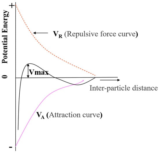 Schematic interaction energy vs. distance profiles of DLVO interaction. The attractive van der Waals and the repulsive electrostatic potentials form the total interaction energy.