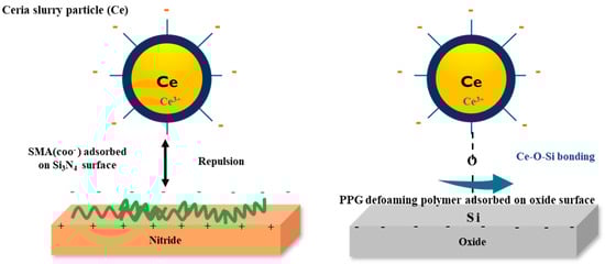 According to DLVO theory [32], an appropriate dispersant concentration can regulate electrostatic double-layer interactions, preventing close contact between ceria nanoparticles and maintaining dispersion, thereby reducing cohesion. Furthermore, as the cohesion between particles decreases, scratches are minimized during the CMP process, allowing for more effective surface treatment and potentially increasing polishing rates and selectivity (as shown in Figure 3).