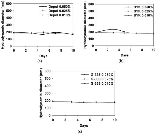 DLS results for stability according to 3 types of defoaming polymers with various concentrations at 60 °C for 10 days: Depol (a), BYK (b), and G-336 (c).