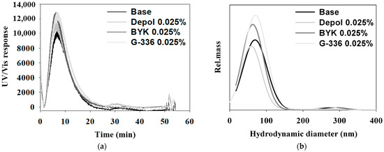 To obtain a more detailed size distribution with the addition of specific defoaming polymers, we conducted AF analysis on ceria slurries without a defoaming polymer (Base) and with three types of defoaming polymers at a concentration of 0.025%, as shown in Figure 10. The retention times were similar for all samples, and the main peak sizes were observed as follows: 72.2 nm for the sample without defoaming polymer, 62.6 nm for the Depol defoaming polymer, 73.3 nm for the BYK defoaming polymer, and 82 nm for the G-336 defoaming polymer. While the sizes analyzed with the BYK and G-336 defoaming polymers were smaller (in the previous DLS analysis) in the AF analysis, they were measured slightly larger compared with the Base and Depol samples. However, since no minor peaks were observed, this indicates a more uniform size distribution. A summary of the results of the AF analysis with the application of defoaming polymers is provided in Table 6.