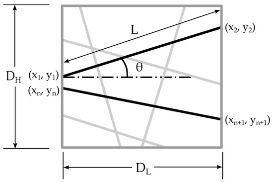 Control of the porosity within the domain was achieved through controlling the domain area and obtaining the coordinates of the generated fibers. As depicted in Figure 1, for a fiber generated at an angle (θ), its starting coordinates are indicated as (x1, y1) and its ending coordinates are (x2, y2). Using the angle (θ) and these known coordinates, it is possible to calculate the length (L) of the fiber within the domain area (DL × DH). Given that the fiber diameter is also known, this methodology allows for the precise maintenance of the domain’s porosity.