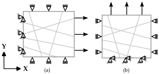Boundary conditions applied in (a) longitudinal and (b) transverse directions to simulate the normal stress response to displacement.