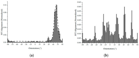 Figure 4a,b show the results of the fast Fourier transform (FFT) analysis, which was used to quantify the alignment of the nanofibers within the mats. For the oriented nanofiber mats collected at a drum speed of 2100 rpm, the FFT alignment value (normalized) ranged from 0.0 to 0.1, indicating a high degree of alignment, with most nanofibers oriented in a single direction and varying within a range of 11 degrees. This consistent alignment was facilitated by the constant rotational speed of the drum, which stabilized the fiber-drawing process and resulted in a uniform diameter range. On the contrary, in the randomly structured mats, the FFT alignment value (normalized) exhibited a smaller fluctuation, from 0.01 to 0.04, suggesting that the fibers were distributed more randomly throughout the mat and did not exhibit a strong directional preference.