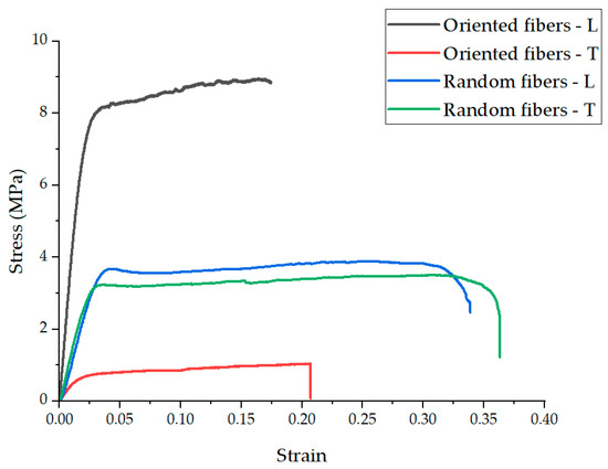 Representative stress–strain graphs for oriented and random structures in the longitudinal (L) and transverse (T) directions.
