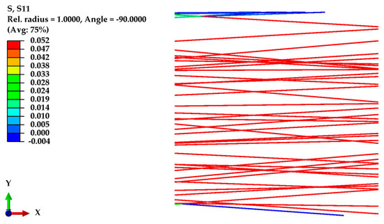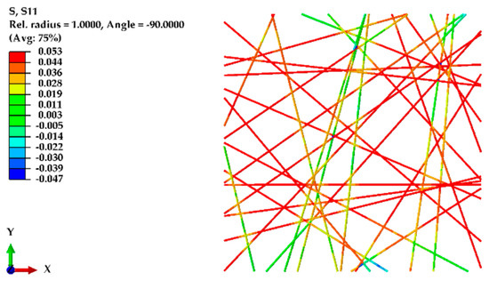 To validate the finite element (FE) model, the initial model was developed based on experimentally obtained data. This model had a domain size of 100 μm × 100 μm, incorporating a 75% porosity level. All the fibers were aligned within a narrow angular range of 11 degrees (from +5.5 degrees to −5.5 degrees), each having an equal diameter of 580 nm and a fiber length between 70 μm and 100.47 μm (depending on the angle (θ) with the X-axis). The elastic modulus of the nanofibers was considered to be 2100 MPa, and their Poisson’s ratio was assumed to be 0.4, providing essential material properties for the simulations. A displacement of 20 μm (20% of the domain length) was applied along the X-axis, with the fracture energy required for breakage set to 13 µN/μm. For simplicity, all the units in the Abaqus simulations were maintained in micrometers (μm). Figure 7 shows the normal stress in the X-axis for an oriented nanofiber mat under displacement.