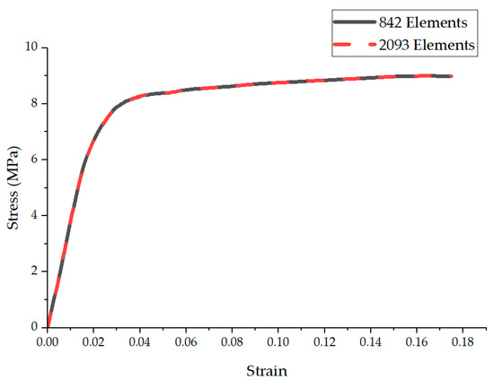 Figure 8 illustrates the effect of mesh refinement on the developed FE model, using the same geometry and parameters but with approximately 2.5 times more elements. The graph compares the normal stress–strain response for systems with 842 elements (represented by a black line) and 2093 elements (indicated by a red dashed line). Interestingly, the graph demonstrates that an increase in the number of elements did not significantly impact the stress–strain behavior of the oriented fibers, which could be attributed to the reaction force being calculated relative to the domain’s cross-sectional area.