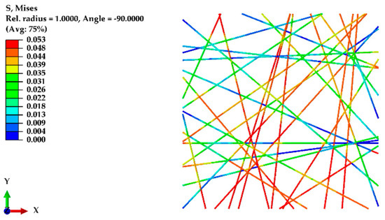 To model the random structure of nanofibers and validate the experimental results, a similar domain size of 100 μm × 100 μm was used, this time considering an 80% porosity, fiber diameters of 720 nm, and a fiber length between 30 μm and 141.44 μm (depending on the angle (θ) with the X-axis and Y-axis). The fibers were randomly distributed within the domain. Displacements were applied along the X-axis and, for comparison, along the Y-axis as well. Figure 9 shows the normal stress along the X-axis in the random structure of nanofibers, while Figure 10 shows the von Mises stress in the random structure of nanofibers under displacement along the Y-axis.
