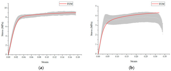 Comparison of FE model predictions for (a) oriented and (b) randomly structured nanofiber mats, highlighting its accuracy in simulating mechanical behaviors. Grey region represents the experimental results with the standard deviation.
