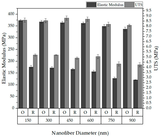 The effect of the nanofibers’ diameter was examined in the range from 150 nm to 900 nm for both the oriented (O) and random (R) structures. Figure 12 reveals that, for the oriented nanofibers with a diameter of 150 nm, an elastic modulus of 374 ± 3 MPa and a UTS of 8.6 ± 0.2 MPa were obtained. In contrast, for the nanofibers with a diameter of 900 nm, the elastic modulus slightly decreased to 337 ± 7.8 MPa, with a UTS of 8.1 ± 0.1 MPa. This decrease in the mechanical properties with an increasing diameter can be attributed to the tendency of fibers with a larger diameter to touch the top or bottom edges of the domain, effectively removing them from the load-bearing structure—a phenomenon which is less impactful for smaller-diameter fibers, as very few fibers reach the top and bottom edges.