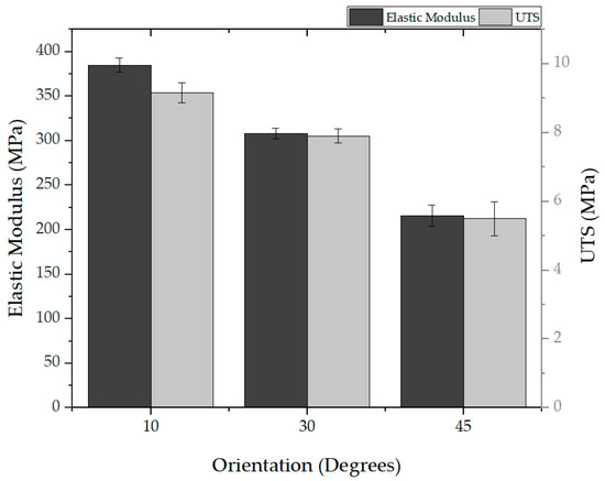 The influence of fiber orientation was also explored, considering orientations of 10 degrees, 30 degrees, and 45 degrees. Figure 13 shows that fibers within a 10-degree range exhibited an elastic modulus of 385 ± 8 MPa and a UTS of 9.16 ± 0.3 MPa, while, in a 45-degree range, the elastic modulus was significantly lower (216 ± 12 MPa, with a UTS of 5.5 ± 0.5 MPa), indicating the critical role of fiber orientation in the mechanical properties of the mat.