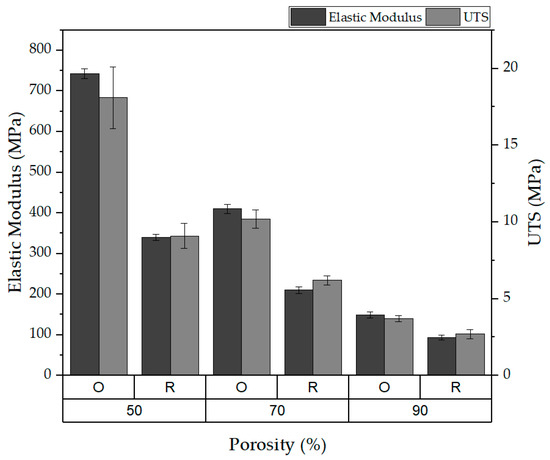 We also examined the effects of 50%, 70%, and 90% porosity levels on the mechanical properties. Figure 14 illustrates that, at a 50% porosity, the elastic modulus and UTS for the oriented fibers were markedly higher (743 ± 12 MPa and 18.1 ± 2 MPa, respectively) than those for the random structure (340 ± 8 MPa and 9.1 ± 0.8 MPa, respectively), demonstrating that increased porosity leads to a reduction in mechanical properties for both fiber structures.