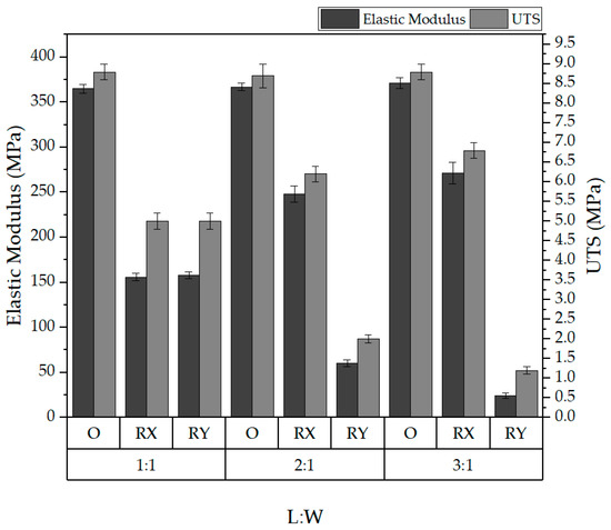 Figure 15 shows that changes in the L:W ratio significantly affected the mechanical properties of the random structure, indicating anisotropic behaviors as the ratio varied. However, the oriented fibers maintained consistent results, highlighting the stability of their mechanical properties despite changes in the L:W ratio.