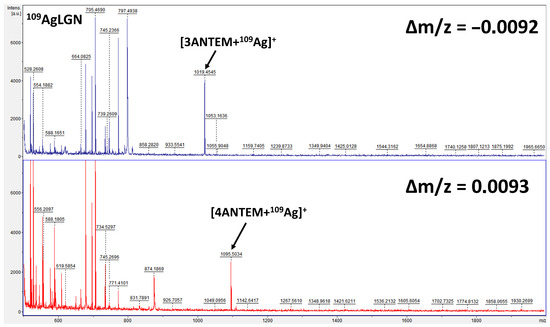 The MS spectra obtained are presented in Figure 3. The information provided by these experiments clearly confirms the successful course of synthesis because the obtained molecular ions are characterized by proper monoisotopic masses, which differ in comparison to the calculated, theoretical ones by 0.0092 m/z for 3ANTEM and 0.0093 m/z for 4ANTEM.