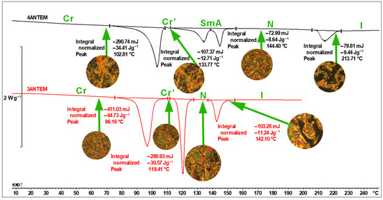 DSC investigations were also performed for 4ANTEM, and the results are given in Figure 8. Each transition can be identified similarly to those in Figure 7.