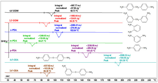 As presented above, the thermal characteristics are different from one agent to another, sometimes even drastically in the collection of isomers (86 °C vs. 192 °C in case of 3,4′-ODA and 4,4′-ODA). The detected melting temperatures of the curing agents alone are of less importance than their influence on the curing process.