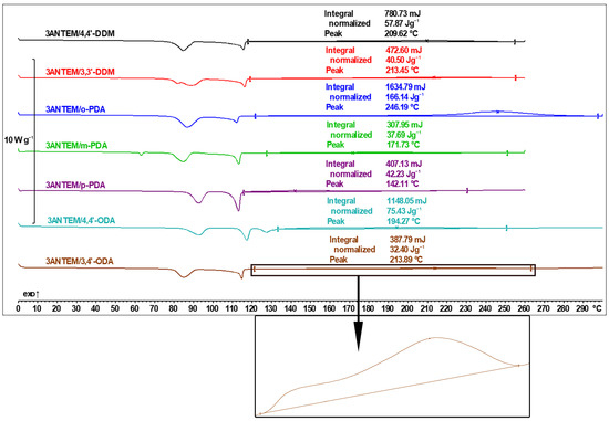 For all the samples, each transition is related to those presented in Figure 4 and Figure 6. If endothermic peaks are present, they are a representation of processes identified via the POM/DSC analysis of the monomer described in Table 1 or the melting of the hardener. Phase changes of the curing agents (3,3′-DDM, m-PDA, and 4,4′-ODA) are visible only if this transition does not fully overlap with monomer-related peaks with higher intensity. Above the LC formation temperature, there are wide, exothermic curing peaks, which, for better clarity of presentation, are magnified in the case of the use of the 3,4′-ODA curing agent.