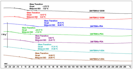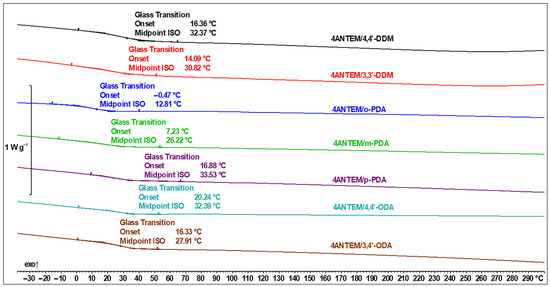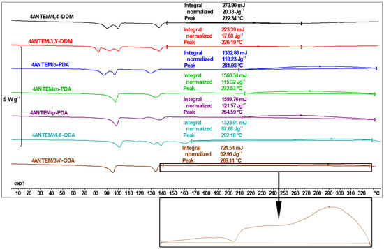 The results for the 4ANTEM resin are consistent with the findings for 3ANTEM. The incorporation of four aromatic rings in the monomer structure allowed us to better distinguish the effect of viscosity on network formation. In the liquid crystalline state, below 220 °C, only DDM amines are able to conduct curing with higher intensity. For all other amines, there is a clear increase in heat generation (the rate of reaction) when the resin transitions into an isotropic state, which is especially visible upon magnification (4ANTEM/3,4′-ODA, brown bottom curve). As liquid crystal, due to its ordered nature, always has higher viscosity than an isotropic liquid created from it, the explanation of detected phenomena seems to be clear. Also, the rotational constraint characteristic of LC compounds makes it harder for the hardener molecules to come into proximity with epoxy groups because of the alignment of mesogens next to each other. Characteristic for this resin is also the fact that if curing starts at a lower temperature (as with DDM amines), its extent seems to be lower, which is evidenced by the fact that those systems have the lowest curing enthalpy. A bigger core structure than that in the case of 3ANTEM seems to allow better infiltration of curing agent molecules between resin scaffolds, resulting in a larger amount of generated heat due to the effect of greater conversion.