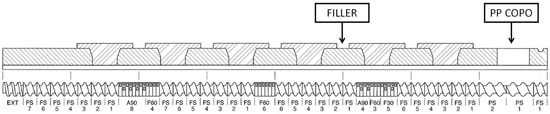 Profile of the screws used in the compounding process. It consists of different elements such as feeding elements (FS, PS), mixing elements (F30, F60, A90) and discharge elements (EXT).