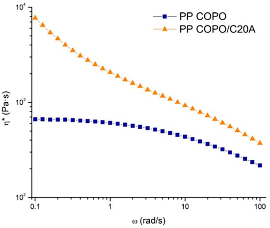 Complex viscosity curves of PP COPO and PP COPO/C20A samples.