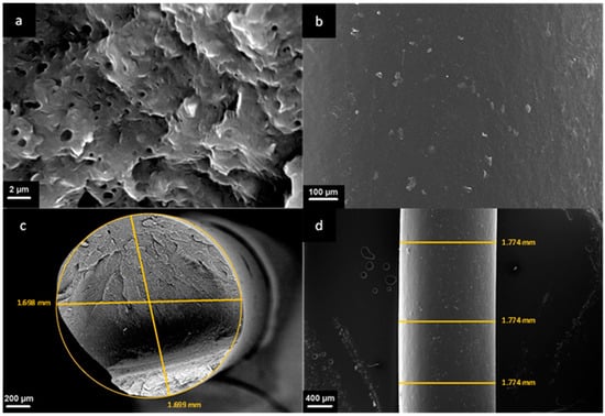 From the SEM micrograph in Figure 3b, referring to the external surface of the filament, it is possible to observe that the surface of the filament appears smooth with no evident defects. Concerning the section of the filament, from Figure 3c, it appears to be almost perfectly circular, with two measured diameters of 1699 mm and 1698 mm, respectively. Finally, the external diameter measured in three different points (Figure 3d) is perfectly constant and equal to 1774 mm and therefore is within the range of values compatible with the 3D printer.