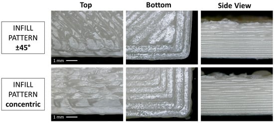 From the optical micrographs reported in Figure 4, the difference between the two infill patterns can be observed. In both cases, starting from the left, the top surface, the bottom surface (in contact with the printing platform) and the side view are depicted. From the side view images, it is evident how the accuracy of the deposited layers decreases when increasing the height of the specimen and no obvious differences can be seen between the two kinds of infill pattern.