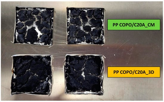 The enhanced behavior of the 3D-printed specimen is also confirmed by the THR curves in Figure 6b. In fact, the FFF-produced specimen shows a curve of lower slope and therefore is characterized by a slower combustion compared to the CM one. It is also evident how the PP COPO/C20A_3D sample shows a higher THR value (115.4 KW/m2) than PP COPO/C20A_CM (99.9 KW/m2), but this can probably be explained by the fact that the 3D-printed specimen had a higher initial weight (7.25 g) compared to the CM one (6.25 g).