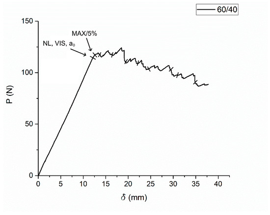 There are multiple ways to determine the start of delamination [34]. The first one is to determine a point from which the load–displacement curve starts to be non-linear. An assumption occurs when determining the point of non-linearity, according to which a crack starts to propagate inside the sample, while the fracture is not visible on the side plane (NL point). The second is to find a point from which a fracture starts to be visible on a side plane (VIS point). In the case of a brittle matrix, these two points can be the same. The third way is to determine a point on a load–displacement curve that corresponds to the intersection between the curve and a straight line with a slope 5% smaller than the slope of the load–displacement curve before the point of non-linearity (5% point). If the intersection occurs later than the maximum point, this maximum point is considered as wanted (MAX point). All three points are shown in Figure 2.