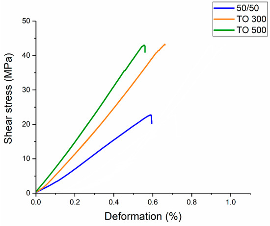 In previous studies, we investigated influence of the carbon fiber contents and surface modification conditions on the mechanical properties of PES-based composites [16]. In order to characterize the interfacial interaction between the CF and the and polymer matrix, an interlaminar shear strength (ILSS) test was conducted. Typical stress–strain curves for different types of composites are presented in Figure 4.