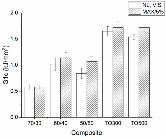 Thus, it was shown that the standard mechanical properties of obtained PES-based composites were strongly dependent on the fiber content in the composites. Moreover, surface modification of the carbon fibers allowed for increased interfacial interaction between the polymer and reinforcement and, consequently, the interlaminar shear strength and flexural strength of the obtained CFRP. Therefore, we assumed that interlaminar fracture toughness should be subject to the same patterns. Figure 6 depicts the results of the ILFT of the obtained composites with different fiber-to-polymer ratios and various conditions of thermal oxidation. Each value of G1c was calculated with the point at which non-linearity started on the stress–strain curve or with the point of visual start of propagation of a fracture (NL, VIS) and maximum load on an initial curve (MAX).