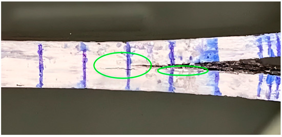 Particularly, only the 70/30 and TO500 composites showed a good correlation between the flexural modulus and calculated modulus values. In the other cases, the effective E-modulus tends to have much higher magnitudes compared with the flexural modulus, which is due to a much bigger value of Δ, as far as it is used for the calculation via Formula (3). The value of Δ depends on the change in compliance with the further propagation of a crack [37]. Hence, a bigger magnitude of this value shows that compliance drops slower with propagation than expected for the ideal delamination case. We consider that such a phenomenon occurs as the result of delamination in interlaminates other than the initial one, leading to a higher consumption of elastic energy and overstated values of the applied load and, consequently, fracture toughness G1C. Figure 7 depicts a typical view of delamination during the test. The green circles highlight areas where delamination and propagation of the crack different from the initial plane occur.