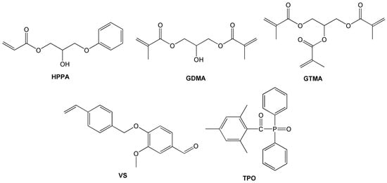 Chemical structures of 2-hydroxy-3-phenoxypropyl acrylate (HPPA), glycerol dimethacrylate (GDMA), glycerol trimethacrylate (GTMA), vanillin styrene (VS) and diphenyl(2,4,6-trimethylbenzoyl)phosphine oxide (TPO).