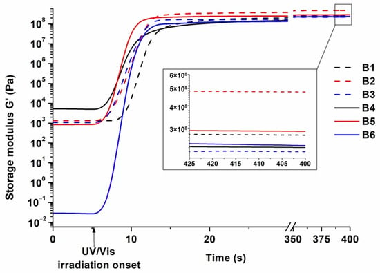 Dependence of storage modulus of resins B1–B6 on irradiation time.