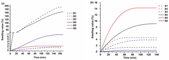 Dependence of swelling value on the duration of swelling of polymers B1–B6 in acetone (a) and toluene (b).