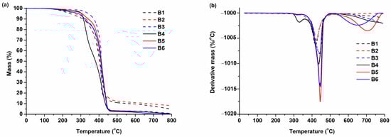 Thermogravimetric curves (a) and differential thermogravimetric curves (b) of polymers B1–B6.
