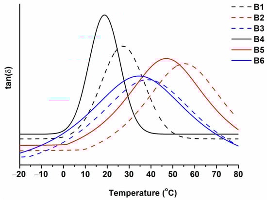 The glass transition temperature of the synthesized polymers was in the range of 19–55 °C. The DMTA curves are presented in Figure 6. Polymers B1–B3 prepared with VS were determined to have a higher glass transition temperature than the corresponding polymers prepared without VS (B4–B6). This was because of the aromatic fragments of VS in their structure. Polymers B1 and B4 showed the lowest Tg values due to their linear macromolecules. The highest values of Tg were demonstrated by polymers B2 and B5 prepared with GDMK. These polymers have a cross-linked structure and the highest values of insoluble fraction, which results in higher values of Tg.